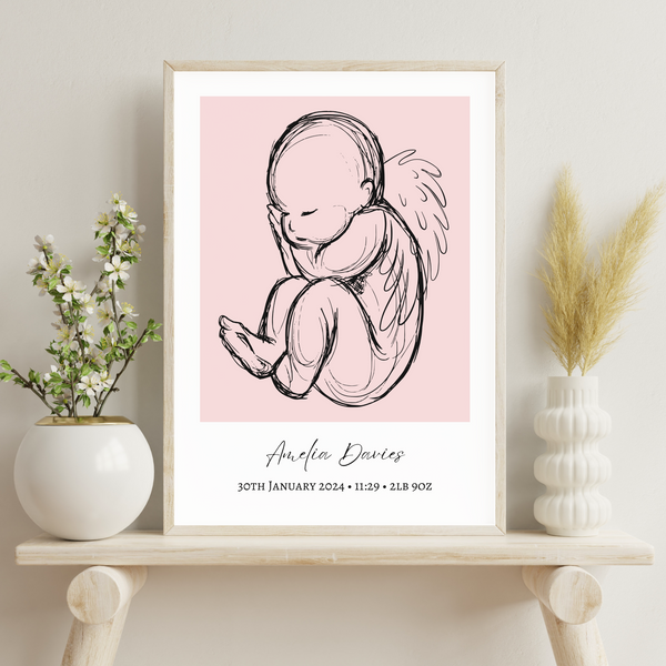 A tender and heartfelt way to honour the memory of a little life gone too soon. This personalised angel baby print features a hand-drawn sketch of a sleeping baby with delicate wings, accompanied by your chosen name or message beneath.