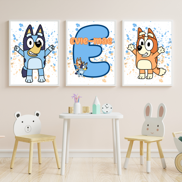 Set of 3 bold, fun designs featuring Bluey, Bingo, and a large personalised name print