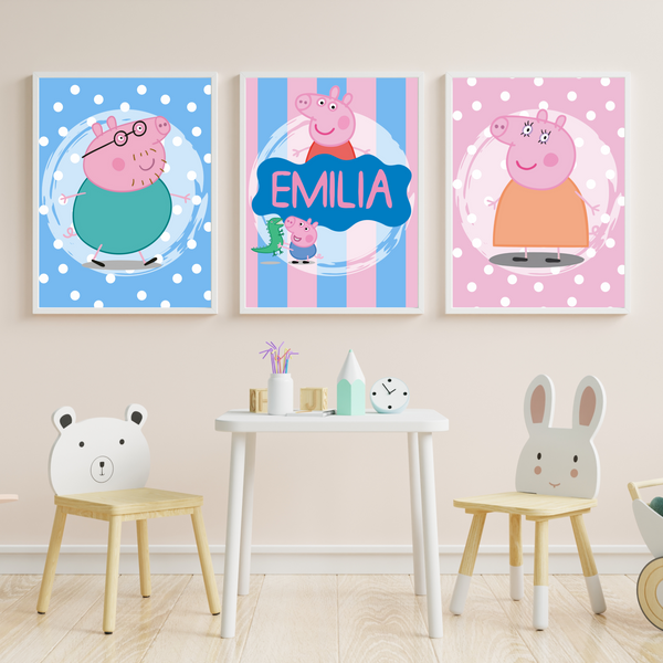 Bring joy to your child’s room with this adorable set of 3 personalised Peppa Pig prints, featuring your little one’s name and their favourite piggy family – Daddy Pig, Mummy Pig, Peppa and George!