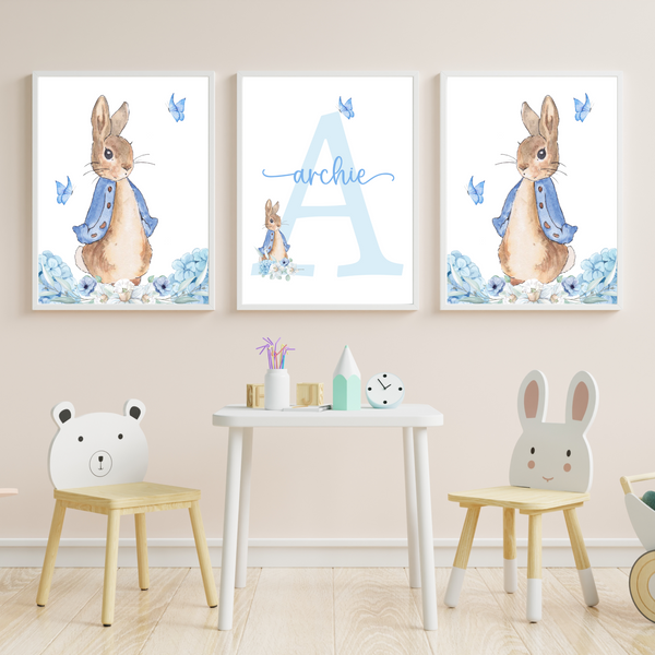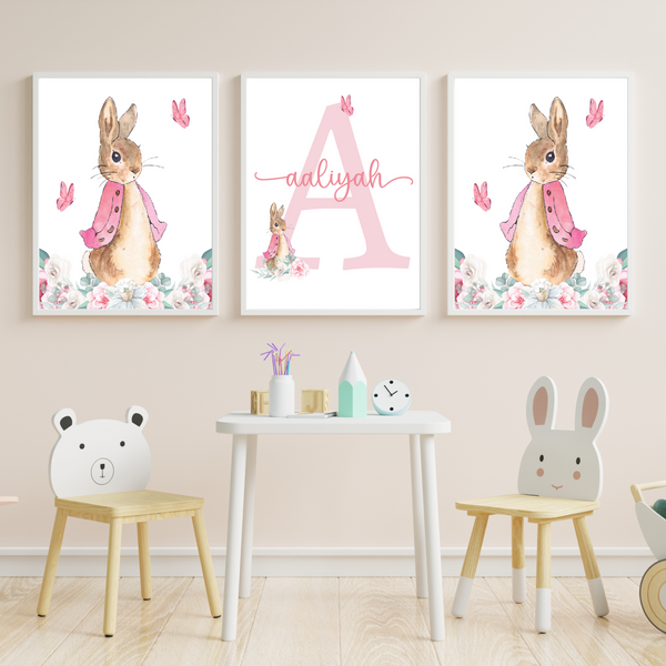 Step into a timeless woodland tale with this charming set of 3 personalised prints featuring either Peter Rabbit in classic blue or Flopsy Bunny in soft pink. These beautifully illustrated designs bring beloved storybook characters to life, personalised with your child’s name and initial to make their space feel truly magical.