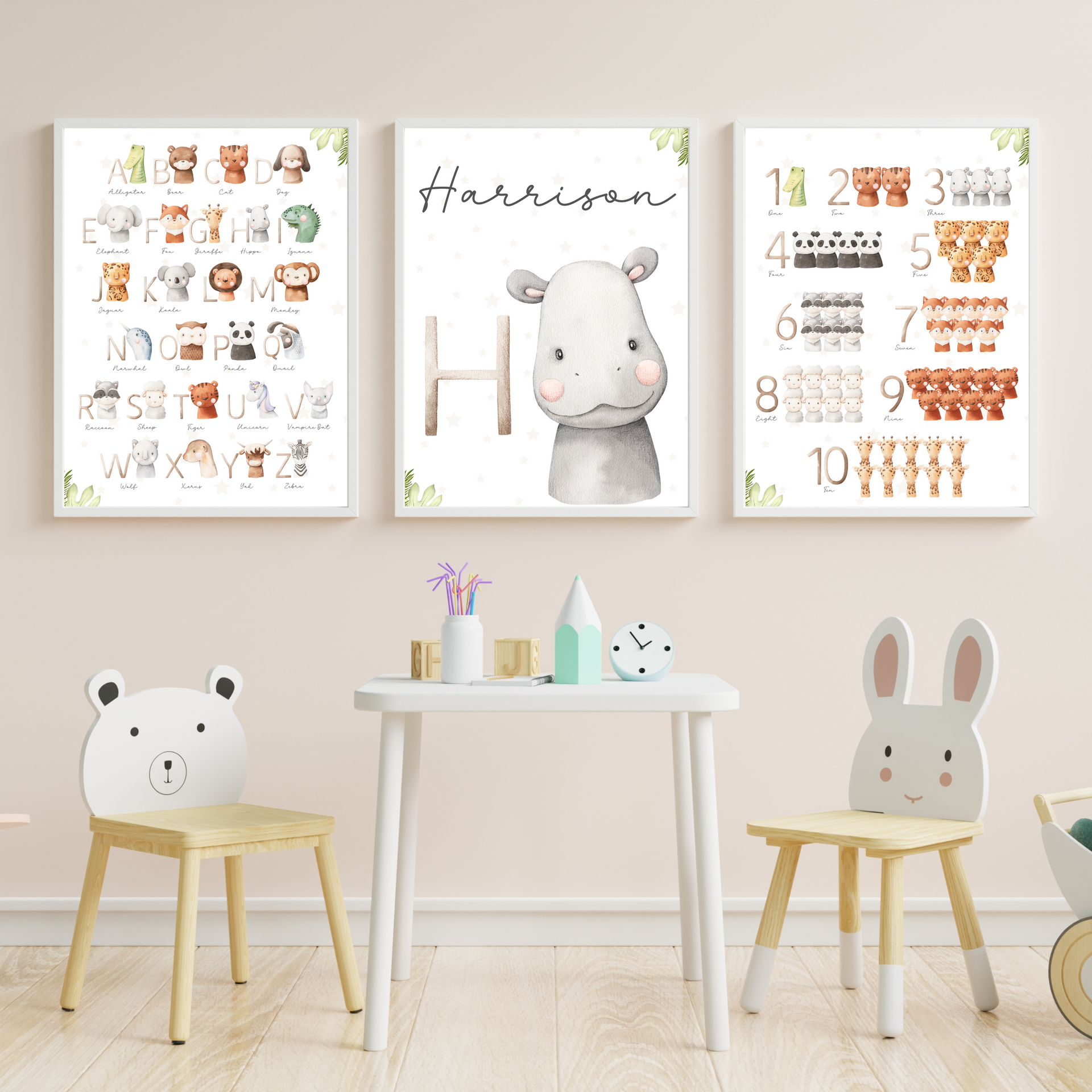 Personalised Animal Nursery Print, Alphabet & Numbers - Set of 3