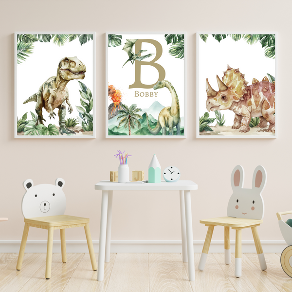 Step back in time and spark your little one’s imagination with this roar-some set of 3 personalised dinosaur prints! Featuring iconic dinos like the T-Rex, Brachiosaurus and Triceratops, this set brings prehistoric magic to any child’s room - with their name and initial right at the heart.