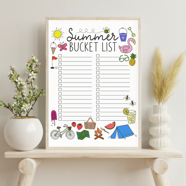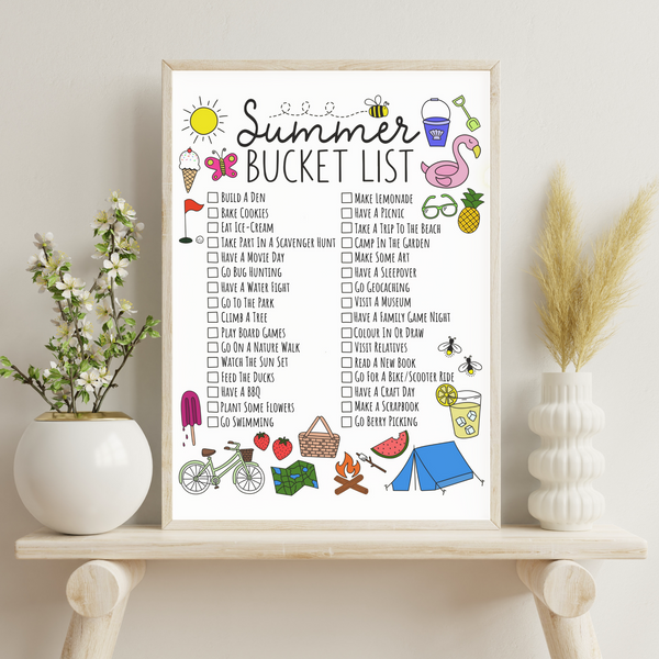 Make this summer unforgettable with our fun and colourful Summer Bucket List Print – available in two styles: pre-filled with exciting activity ideas or a blank version ready for your own adventures!