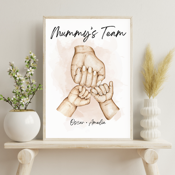 Celebrate the heart of your family with our “Mummy’s Team” personalised print — a heartfelt keepsake capturing the unbreakable bond between a mother and her children. Featuring a beautifully illustrated fist bump with up to 5 children’s hands, each one lovingly customised with names.