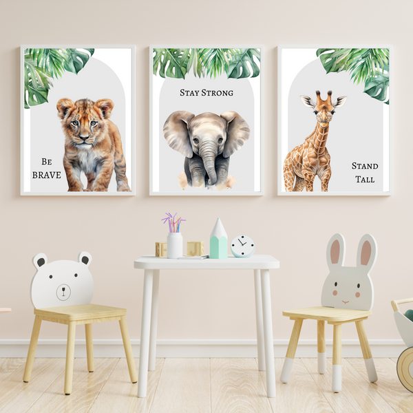 Encourage strength, confidence and kindness with this bold and beautiful set of 3 safari animal prints. Featuring a courageous lion cub, a wise elephant, and a graceful giraffe, each print includes a motivational message to uplift and inspire your little one every day.