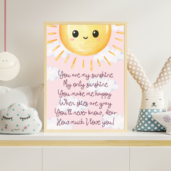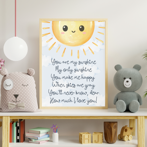 Brighten up your little one’s room with this sweet and cheerful “You Are My Sunshine” print, featuring the classic lullaby lyrics and a smiling sun to warm any space. A perfect gift for a nursery, playroom, or child’s bedroom.